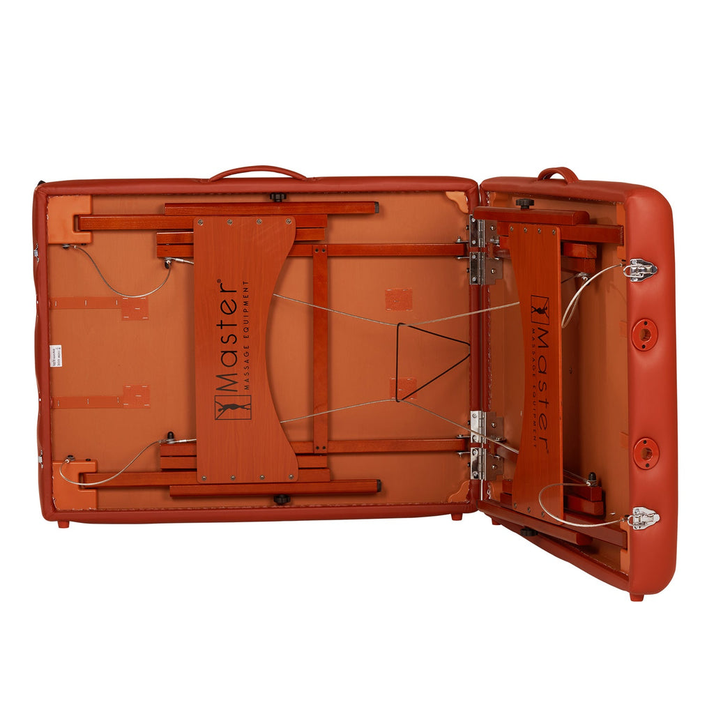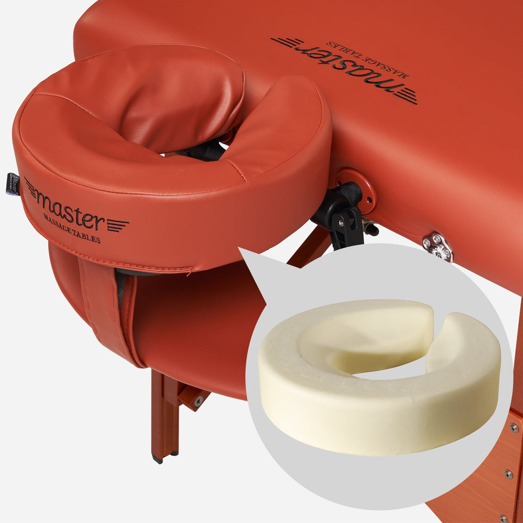Master Massage's Fairlane Pro in the most popular 30-inch size for portable massage tables is still big in comfort! Featuring Master Massage's patented Multi-Layer Small Cell Foam which is designed to be denser than other foams on the market, your clients will experience total relaxation. The Cinnamon color PU upholstery is oil- and water-resistant, CFC-free and has a denim-like backing for added durability, all protected by Master Massage's Lifetime Limited Assurance. European Beech wood legs are protected by rich and glossy elm-colored Dura-Seal finish, and all wood used in the portable facial bed is formaldehyde- and carcinogen-free and meets California Air Resources Board (CARB) law. This convenient portable spa massage table includes an Auto-Lock leg opening system for quick and easy setup in seconds, exclusive Numbered Holes system on legs for easy adjustment, Duo-Plane hinges for increased strength of the foldable spa table, leg-brace Stabilizer Bar for added strength and aiding table opening and closing, and Non-Skid, Non-Mark foot pads to keep the foldable lash table in place. This professional folding spa table package also includes a Simplicity adjustable face cradle, memory foam cushioned face pillow, custom arm rest and free carrying case.