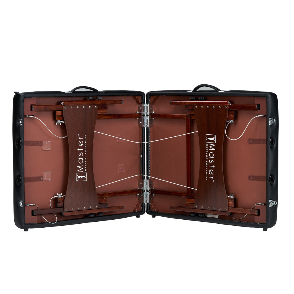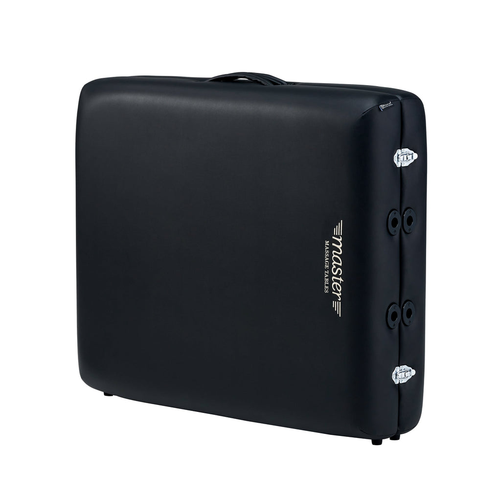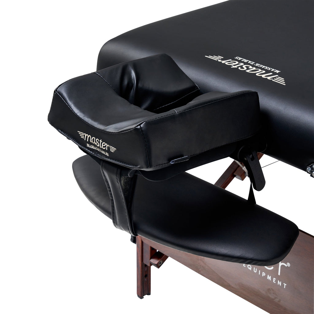 Master Massage's Del Ray Pro foldable spa table is a best seller for many reasons! One reason is the ultimate comfort, this wooden spa bed affords to clients both with its 3" thick layer of Multi-Layer Small Cell Foam™ and its Big Top™ bed design, which gives 26% more cushioned space. The cushioning is protected by beautiful Sand/Black colored PU upholstery that is antibacterial oil- and water-resistant, CFC-free, and features a denim-like backing to reinforce the upholstery durability. The square corners of the Del Ray wooden massage table have been proven by anatomical research to relax the shoulder area more than standard wooden lash beds, giving clients an even better therapeutic experience. All wood used in the portable beauty bed is formaldehyde- and carcinogen-free—meets California Air Resources Board (CARB) law.