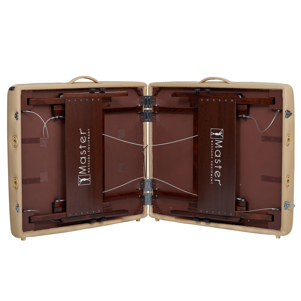 Master Massage's Del Ray Pro portable facial bed is a best seller for many reasons! One reason is the ultimate comfort it affords to clients both with its 3" thick layer of Multi-Layer Small Cell Foam™ and its Big Top™ bed design, which gives 26% more cushioned space. The cushioning is protected by beautiful Sand/Black colored PU upholstery that is water-resistant, CFC-free, and features a denim-like backing to reinforce the upholstery durability. The square corners of the Del Ray wooden massage table have been proven by anatomical research to relax the shoulder area more than standard portable massage beds, giving clients an even better therapeutic experience. All wood used in the portable lash table is formaldehyde- and carcinogen-free—meets California Air Resources Board (CARB) law.