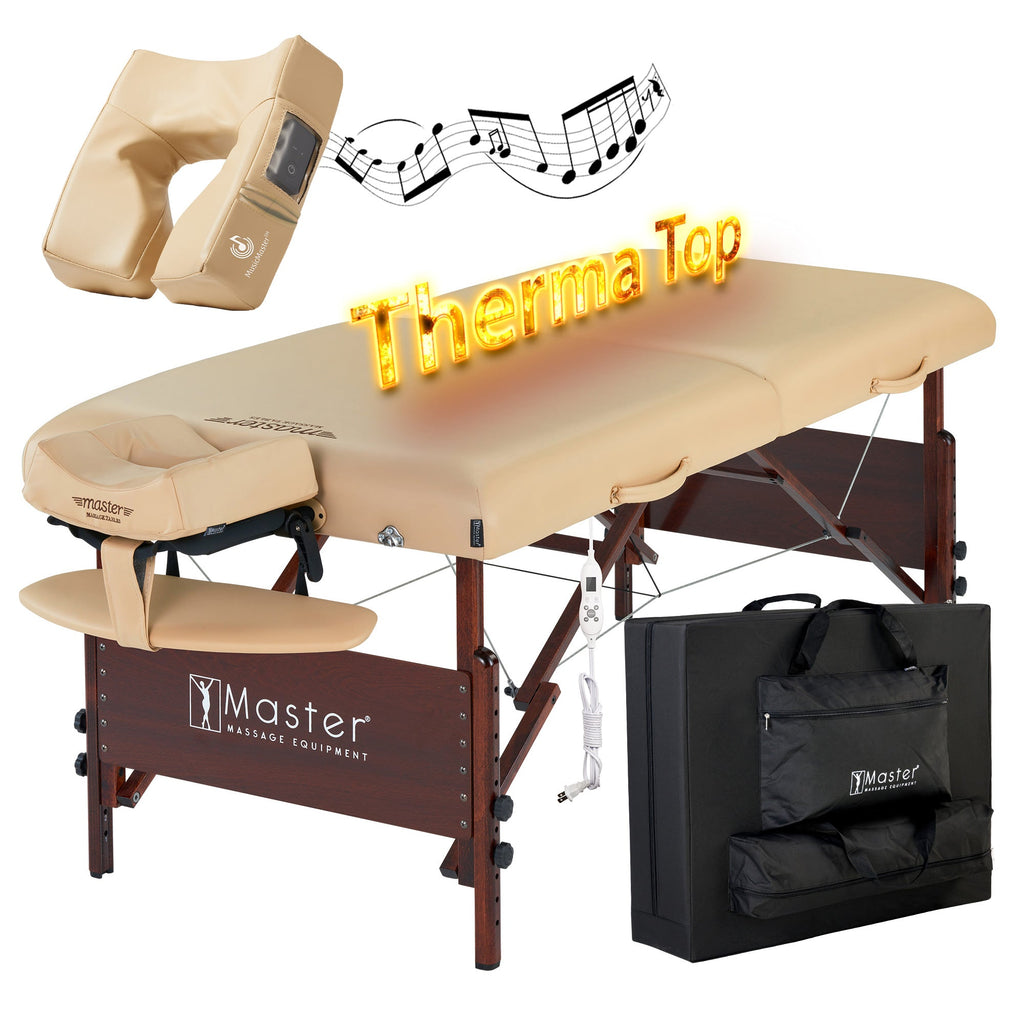 PACKAGE INCLUDES: 30" Del Ray Therma- Top Massage Table, Ergonomic Adjustable Face Cradle, Memory Foam Face Pillow, Contoured Arm Rest Shelf and 2 Pocket Carrying Case.