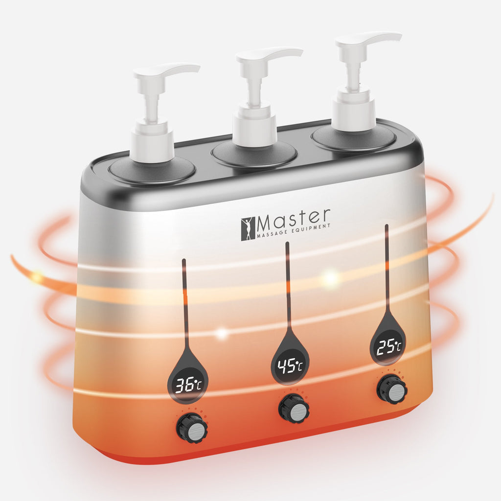 • Sleek and modern design • Compact and lightweight construction for portability • Warms massage oils, lotions, and creams • Warms 3 bottles simultaneously, individually removable bottles • 5 temperature settings, automatic temperature control and protection • Only takes about 20 minutes to reach the constant temperature 60°C/140°F • Includes 3-piece removable high quality bottles • Easy clean surface, auto safety shutoff after 8 hours